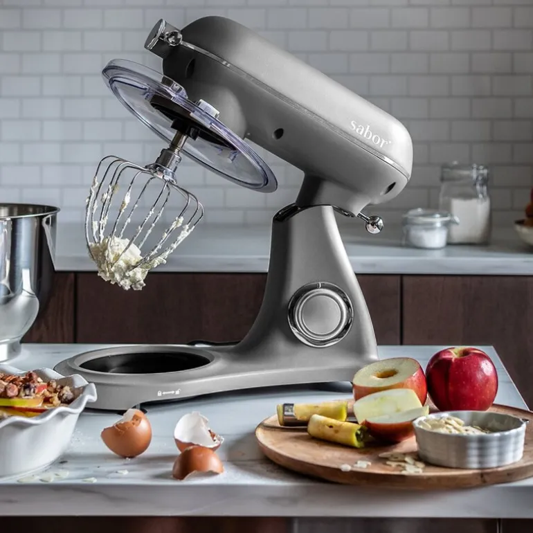 Sabor Ultimate kjøkkenmaskin 6,5L i lys grå og frostet fargekombinasjon. Denne kraftfulle kjøkkenmaskinen fra Sabor er et godt valg for alle som verdsetter kvalitet og design. Med en imponerende motor på 1800W, er dette en av de sterkeste maskinene på markedet, ideell for alt fra lett vaffelrøre til tung deig. Med en kapasitet på 6,5 liter kan du enkelt blande opptil 1,5 kg deig om gangen. Den moderne, stilrene utførelsen gjør at maskinen passer perfekt inn i ethvert kjøkken.