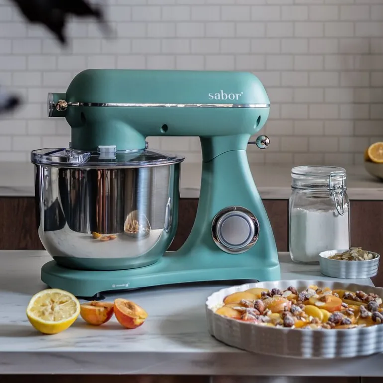 Sabor Ultimate kjøkkenmaskin 6,5L i lys grønn og frostet fargekombinasjon. Denne kraftfulle kjøkkenmaskinen fra Sabor er et godt valg for alle som verdsetter kvalitet og design. Med en imponerende motor på 1800W, er dette en av de sterkeste maskinene på markedet, ideell for alt fra lett vaffelrøre til tung deig. Med en kapasitet på 6,5 liter kan du enkelt blande opptil 1,5 kg deig om gangen. Den moderne, stilrene utførelsen gjør at maskinen passer perfekt inn i ethvert kjøkken.