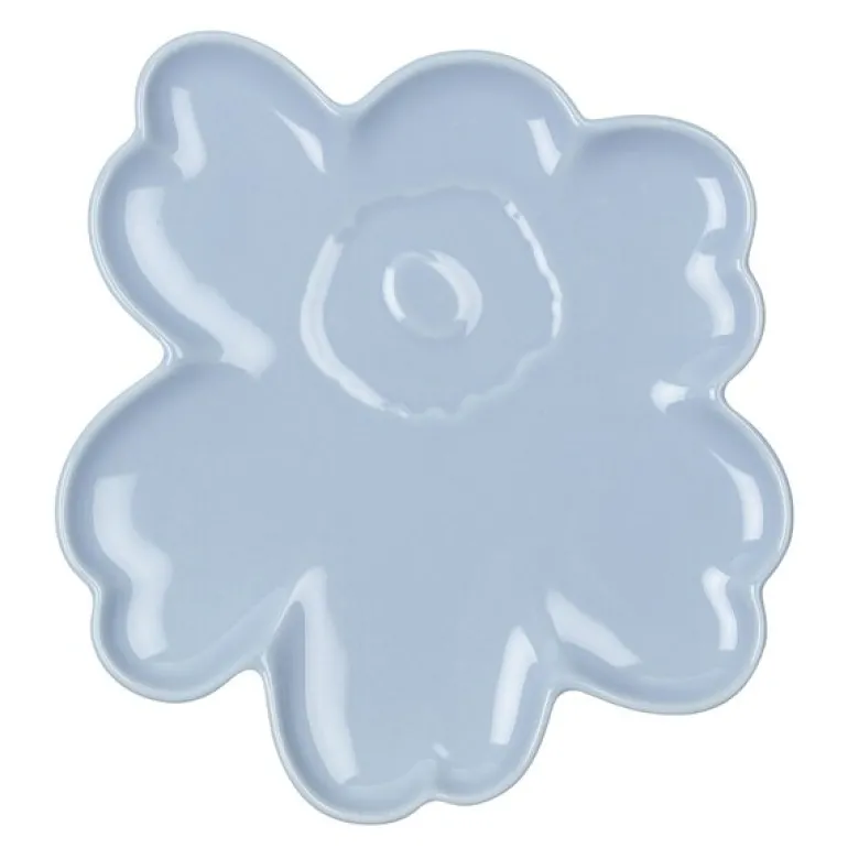 Marimekkos Unikko-asjett er en elegant tolkning av det ikoniske blomsterdesignet, formet som en stilisert blomst. Med en diameter på 20 cm er den ideell for servering av småretter eller som en del av en dekorativ borddekking. Den er laget av keramikk med en delikat lys blå glasur, som gir et mykt og raffinert uttrykk.