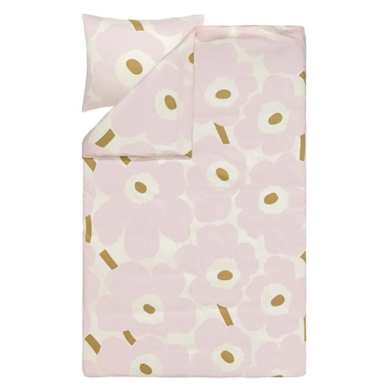 Mønsteret Unikko, designet av Maija Isola i 1964, er en av Marimekkos mest ikoniske designklassikere. De store, stiliserte blomstene i hvitt, rosa og beige skaper en rolig og harmonisk atmosfære som passer i ethvert interiør.