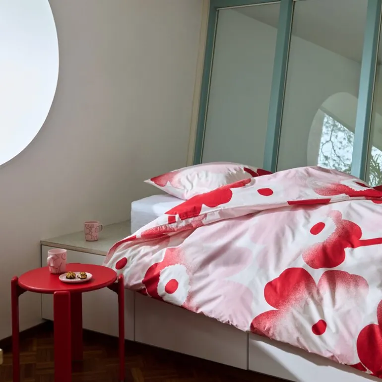 Unikko Häivähdys-mønsteret, med sine karakteristiske blomster i rosa og rød, tilfører et friskt og energisk uttrykk til soverommet. Marimekko har siden 1951 vært en pioner innen skandinavisk design, kjent for sine dristige mønstre og kvalitetsmaterialer som skaper både visuell glede og komfort.