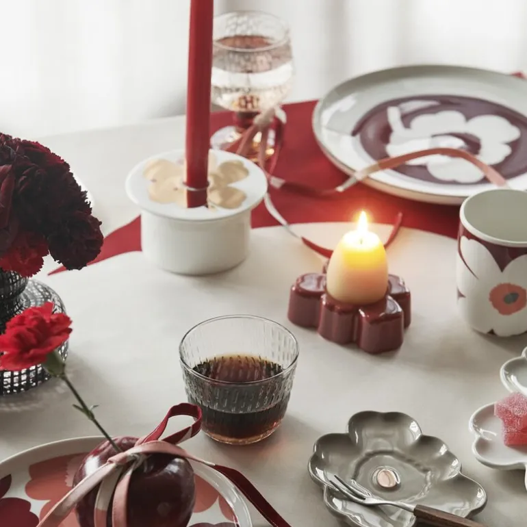 Unikko tallerken 25 cm hvit/mørk kirsebær/brun fra Marimekko er en elegant tallerken i hvitt steintøy, perfekt for både hverdagsbruk og spesielle anledninger. Tallerkenen har et ikonisk Unikko-mønster med en stor Unikko-blomst i midten og en håndmalt brun kant som gir en vakker kontrast til det lyse steintøyet. Unikko tallerken er et utmerket valg for de som setter pris på tidløst design og ønsker å tilføre farge og glede til bordet.