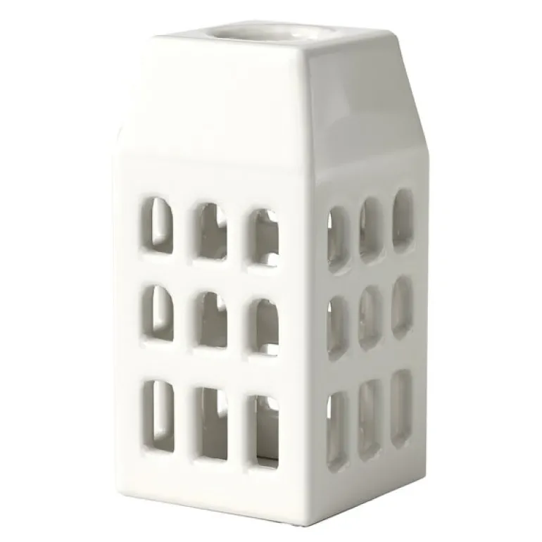 Dekorativt lyshus, Mini høyhus 9 cm, fra Urbania-serien til Kähler. Nyt klassisk bygningskunst fortolket i blankglasert keramikk gjennom Kählers håndlagde designtradisjoner. Med denne miniutgaven av et av Urbania-seriens ikoniske lyshus får du en unik variant av kronelys som vil skape en rustikk og koselig atmosfære i ethvert rom. Lysestaken Urbania Lyshus Mini Høyhus er 9 cm høy, og med hvert vindu utskåret for hånd får du en både autentisk og avslappet stemning, der kronelysestakene med sine små størrelser gjør dem helt perfekte til å skape en variasjon i samlingen av Urbania-lyshus. Plassert sammen med alle de andre Urbania-lyshusene, som i likhet med Mini Høyhus også er designet av Mette Bache og Barbara Bendix Becker, vil de skape en ny og annerledes bevegelse i bylivet. Med i alt fire fortolkninger av de klassiske bygningene fra Urbania-serien som kronelysestaker vil du enkelt og stilfullt kunne lyssette din helt egen ikoniske keramikkby.