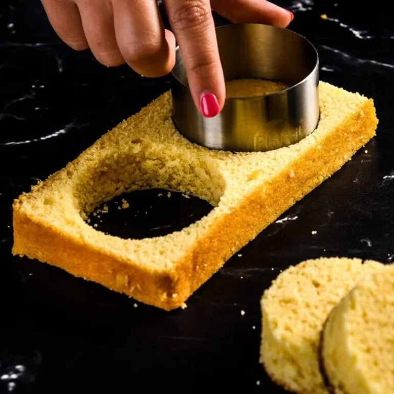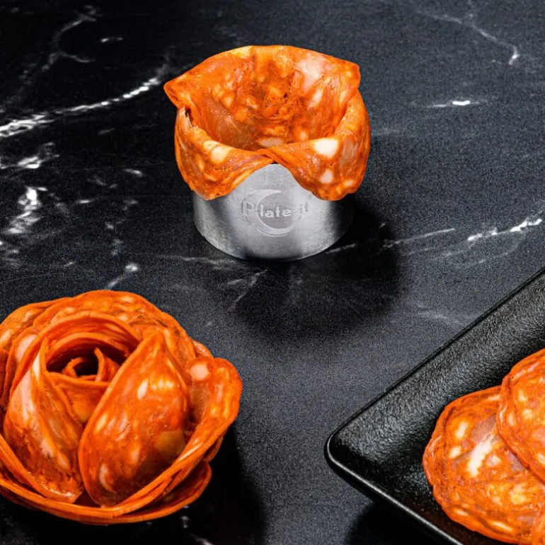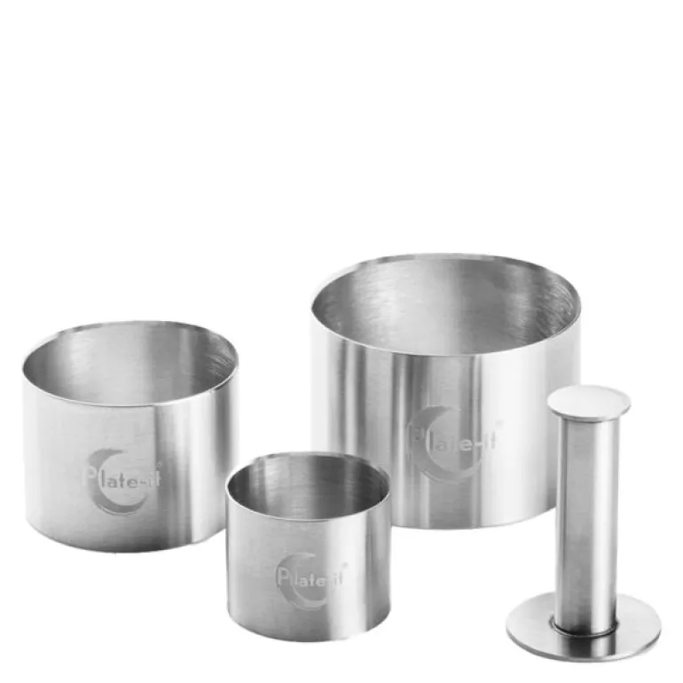 Med dette firesettede utstikksformsettet i stål fra Plate It kan du skape stilige og runde anretninger, enten det er kakebunner, småretter eller rene komponenter som ris eller puré. Fyll formen og bruk den medfølgende pusheren for å få et jevnt resultat uten å skade presentasjonen.