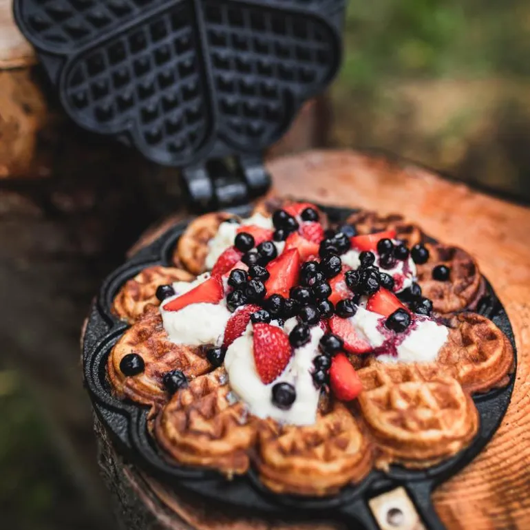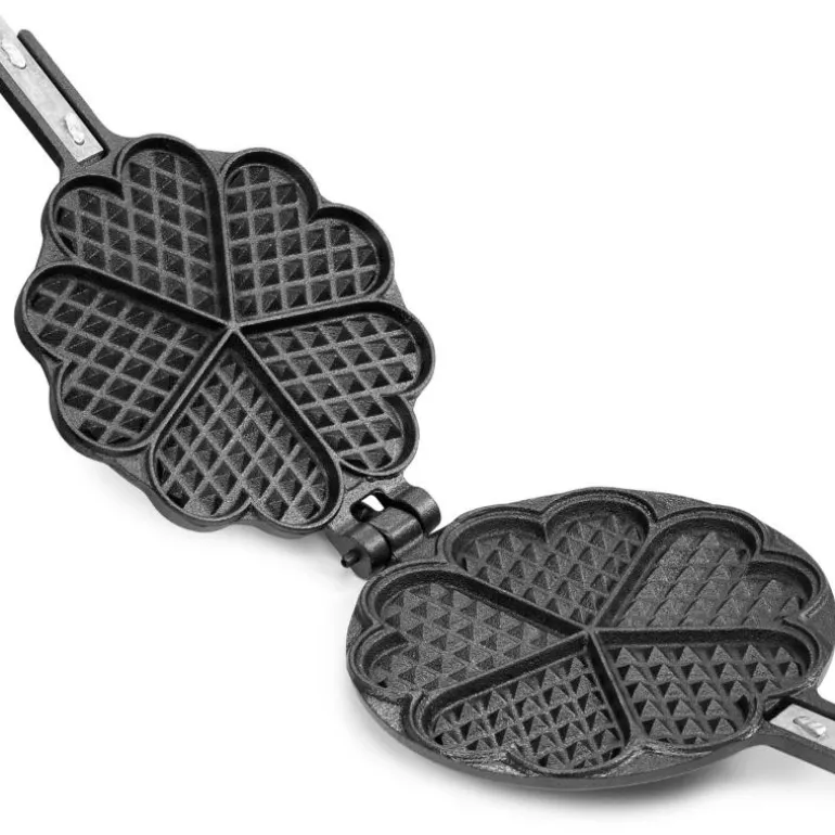 Vaffeljern i støpejern fra Hällmark, med fem hjerteformede vaffelbiter til bruk over åpen ild. Å lage vafler på bål er et nyttig triks for å få barn til å sette pris på friluftsliv. Fungerer også over grillen. Trehåndtak og skaftlengde ca 45 cm. Størrelse ca 18 × 18 cm.