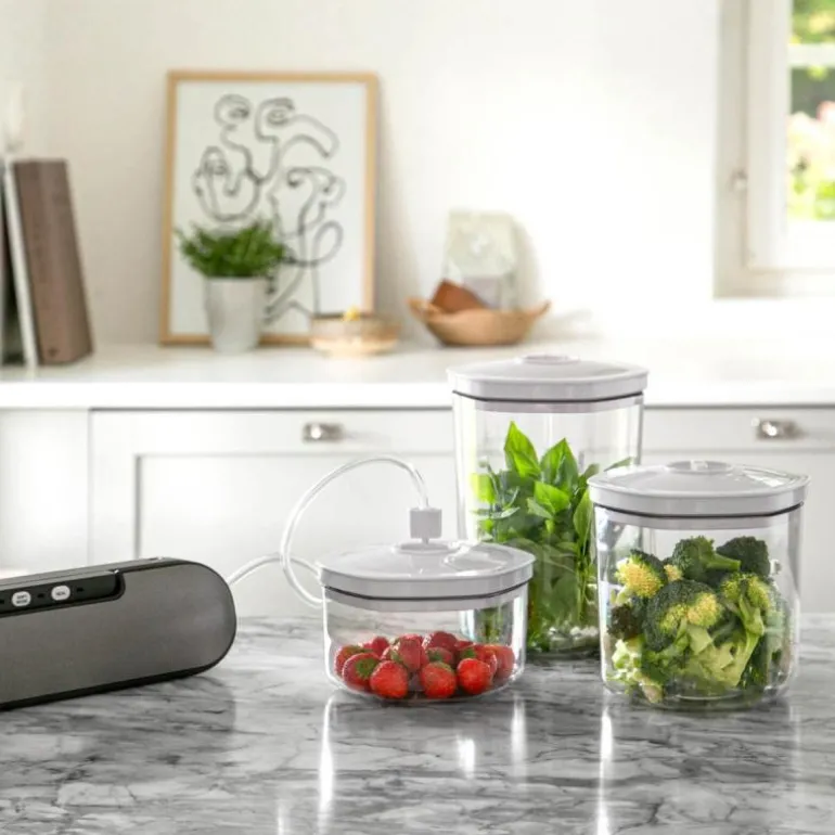Champions vakuumbeholder forlenger matens holdbarhet opptil fem ganger. I beholderne pakker du enkelt skjøre eller flytende matvarer som f.eks. sauser, supper, frukt eller grønnsaker. Bruk Champions vakuumbeholdere for å marinere f.eks. kjøtt eller kylling. På kun 15–60 minutter oppnår man samme effekt som etter flere timer med tradisjonell marinering. – Godkjente for bruk med matvarer – Laget av BPA-fri plast – Beholder: Small 0,7L, medium 1,4L, large 2L – Innhold: 3 stk. beholdere, 1 stk. universal sugeslange