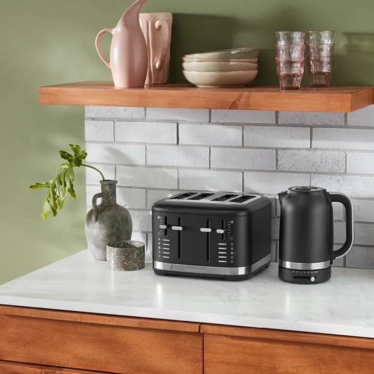 Stor vannkoker 5KEK1701EAC 1,7L i matt svart, fra KitchenAid. Vannkokeren kommer med variabel temperaturkontroll, og varmer raskt opp vannet til ønsket temperatur fra 50 til 100°C. Den automatiske oppvarmingsteknologien sørger for at vannkokeren koker vannet, og slår seg av automatisk når vannet er kokt opp.