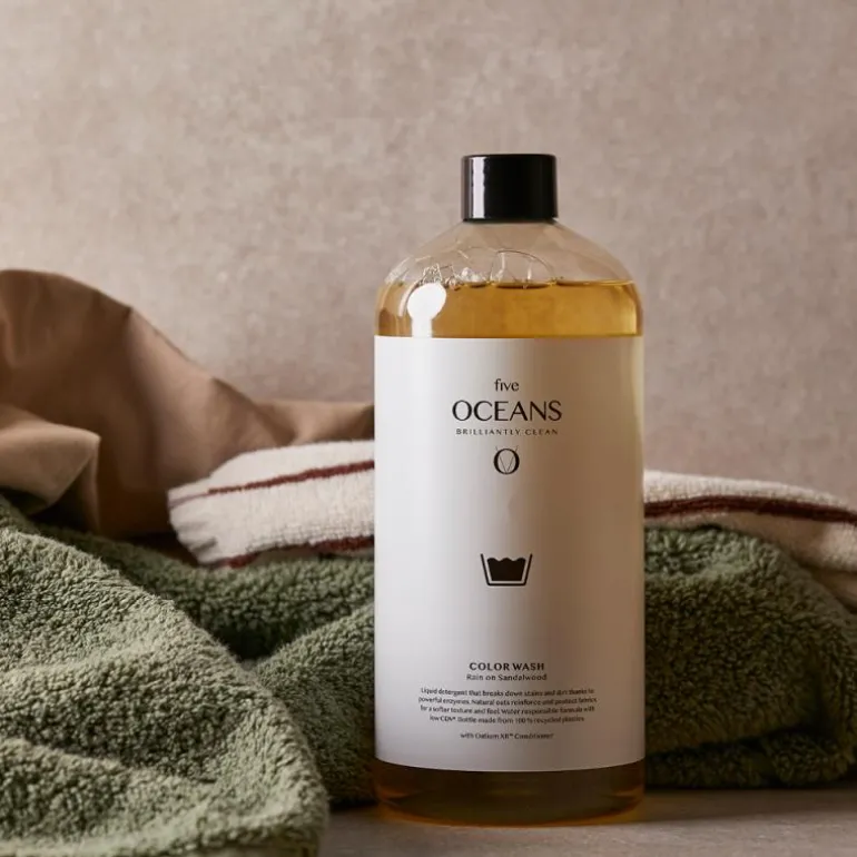 En liter vaskemiddel til farge tøy. Five Oceans avanserte fargevaskemiddel inneholder effektive enzymer som bryter ned selv plagsomme flekker. Deres patent, Oatium XR® styrker stoffet på fibernivå for å beskytte klærne mot slitasje og bidrar til å opprettholde fiberstrukturen for en mykere tekstur og følelse. Lukter mildt av grønne og florale toner samt sandeltre og patchouli.