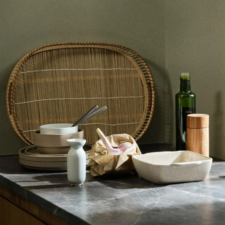 Beige ildfast form, 40x26x8 cm, i serien Vig fra Broste Copenhagen. Den populære ovenfaste serie fra Broste Copenhagen, som i forveien finnes i svart, har nå også kommet i en delikat beige farge. Det særlige ved serien er at den kan tåle å komme direkte fra fryser til ovnen og omvendt. Serien er laget i glassert steintøy og har en overflate som gjør at maten slipper lett.
