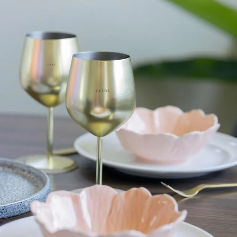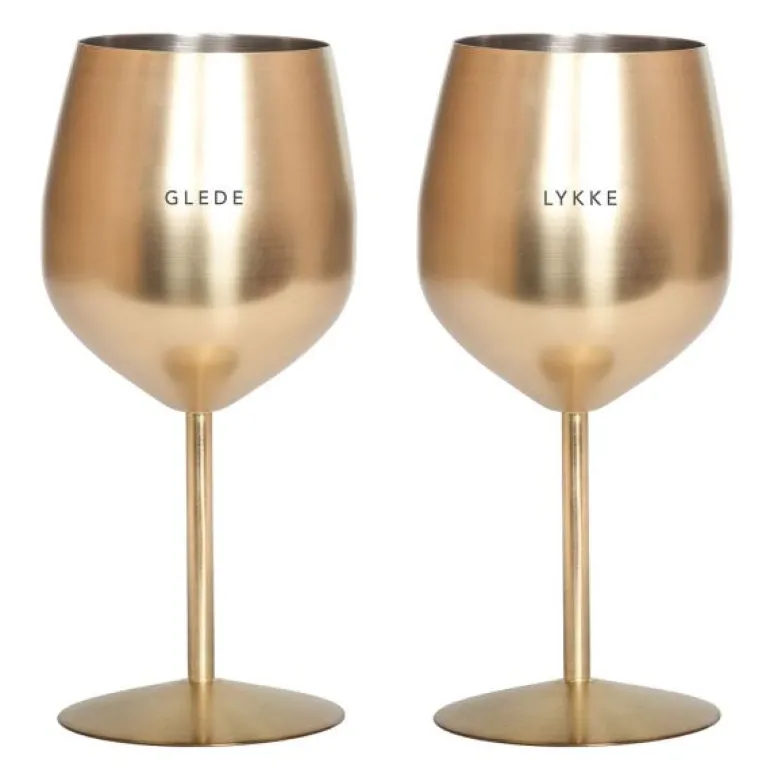 Vinglass i stål GLEDE & LYKKE 45 cl 2 stk gull fra PictureIt er den perfekte måten å bringe litt ekstra glamour til festen. Disse populære «realityserie-vinglassene» selges i sett av to, hvor det ene glasset har teksten GLEDE og det andre LYKKE. Disse elegante vinglassene, laget av rustfritt stål, knuser ikke og holder drikken kald lengre, noe som gjør dem ideelle for både innendørs og utendørs bruk.