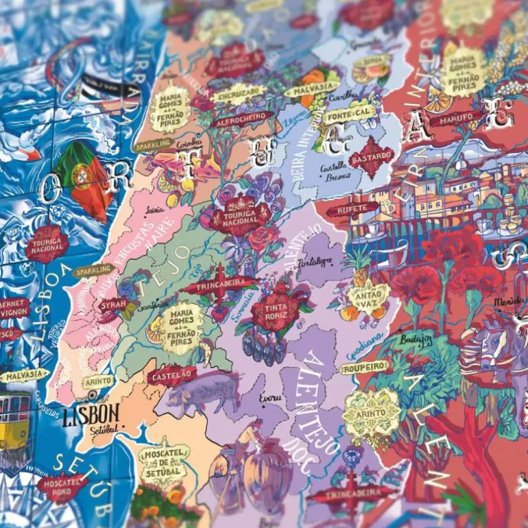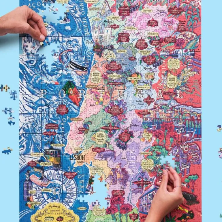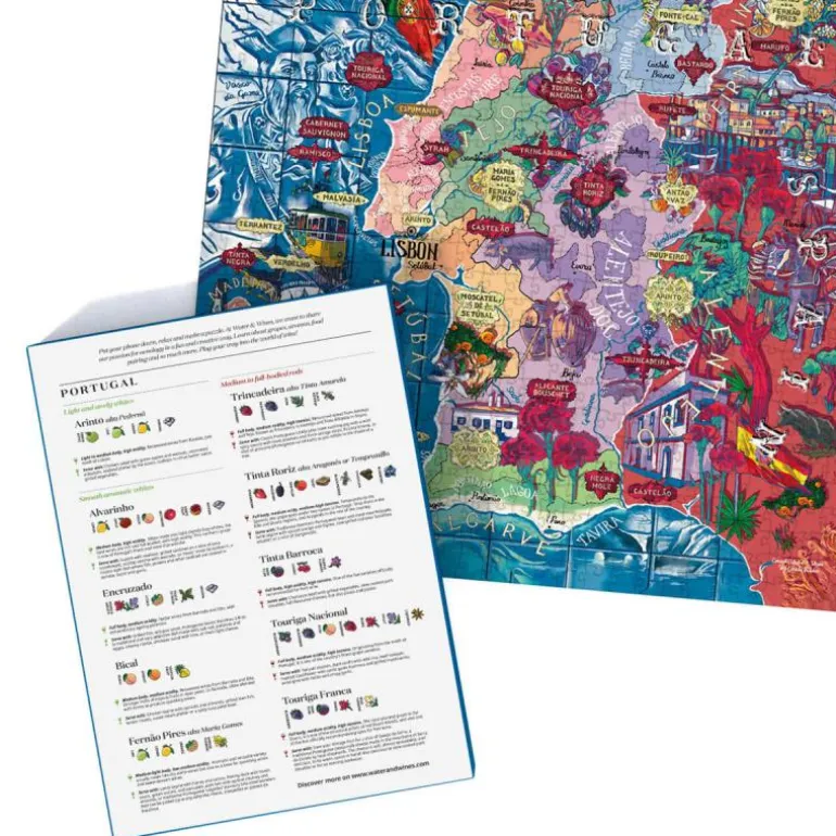 Med et fantastiskt håndtegnet kart over Portugal, løfter vårt portugisiske vinpuslespill frem landets mest fremtredende vinproduserende regioner, hoveddruetyper og mest anerkjente appellasjoner. Puslespillets design er omsorgsfullt kuratert av vår egen sommelier, og på esken finner du drueprofiler, aromaer, hovedkarakteristikker og tips for matkombinasjoner! Hver illustrasjon er håndlaget, og vår design ble nøye gjennomgått med hjelp fra noen av verdens beste sommelierer.