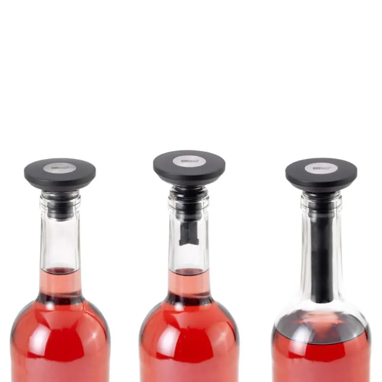 Vinstopper i silikon gjør flasken lufttett. Flat utforming som gjør den ideell for oppbevaring i kjøleskapsdøren. Laget i BAS og PC plast og 18/8 stål. Den er 5 cm i diameter og 3,5 cm høy. Kan rengjøres i oppvaskmaskin.