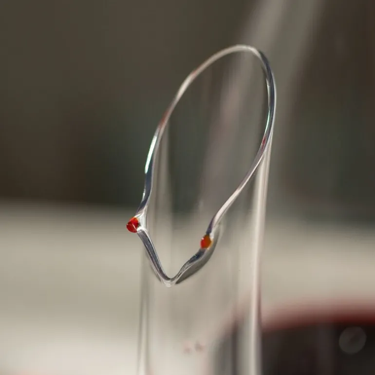 Riedel Vitis dekanter er en utsøkt kombinasjon av funksjonalitet og kunstnerisk dyktighet, inspirert av elegansen til en påfugl. Denne karaffelen har en unik og iøynefallende silhuett, preget av to karakteristiske røde «øyne» som rammer inn den nebbformede åpningen. Designet av Maximilian J. Riedel, er denne karaffelen ikke bare en fryd for øyet, men den forbedrer også skjenkeopplevelsen, og demonstrerer samtidig den eksepsjonelle ferdigheten til Riedels glassblåsere. Den lange, slanke halsen, som minner om den ikoniske Swan karaffen, sikrer en presis og grasiøs skjenking, selv på avstand, noe som har gjort den til en favoritt blant sommelierer.