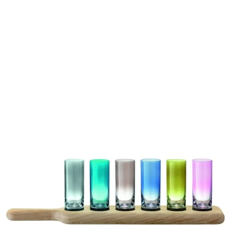 Dette settet fra LSA International inneholder seks shotglass i forskjellige farger, elegant arrangert i et solid eikebrett med tilpassede fordypninger. Glassene passer perfekt til servering av ulike typer brennevin som vodka og tequila.