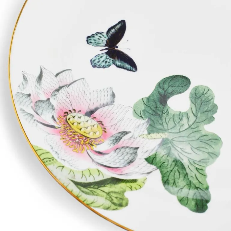 Waterlily tallerken 27cm. Fargene og designene på Waterlily tallerken 27 cm er en del av Wedgwood Wonderlust-kolleksjonen, og er inspirert av planter som vokser i Amazonas. Laget av benporselen med gull-dekorert kant, er det designet for å skille seg ut og begeistre. Kombineres gjerne med samsvarende eller kontrasterende mønstre, avhengig av stilen din. Håndvask anbefales.