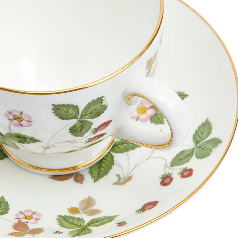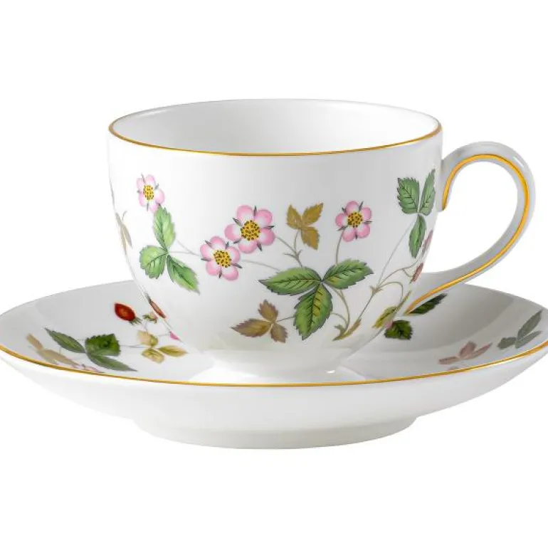 Wild Strawberry Teacup & Saucer Leigh. Den ikoniske Wild Strawberry-kolleksjonen utgjør en del av hjertet av Wedgwood, og dens popularitet har gjort denne serien til en høyt elsket bestselger over hele verden i over 50 år. Sjarmen til de fint tegnede bladene, blomstene og saftige røde jordbærene gjenskaper en engelsk sommer med ettermiddagste, jordbær, krem og godt selskap. En skinnende kant av 22 karat gull fullfører dekorasjonen av dette elegante serviset. Mange av delene i kolleksjonen er laget i England ved å bruke det tradisjonelle håndverket som er synonymt med Wedgwood.