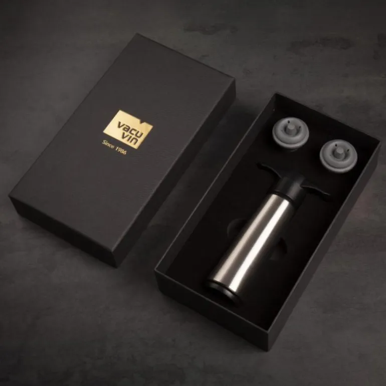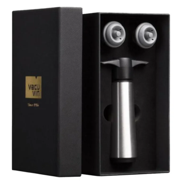 Vacu Vin Wine Saver 3-pakning i elegant svart og sølv kommer nå i en flott gaveeske. Denne vinsparepumpen fjerner effektivt luften fra åpnede flasker og forsegler dem med en gjenbrukbar gummipropp, noe som skaper et vakuum for å bremse oksidasjonsprosessen og bevare vinen over lengre tid. Enkelt å bruke – bare plasser vakuumproppen i flasken og pump til den gir fra seg et «klikk».