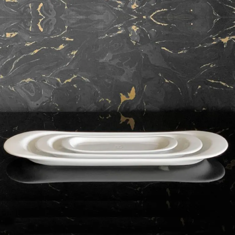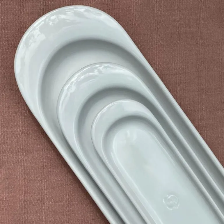 Sett med 3 serveringsfat i hvitt porselen på henholdsvis 20 cm, 30 cm og 40 cm. Kay Bojesen produserte sin ikoniske fiskefat i sølv på 1950-tallet. Fiskefatet hvilte på et trebrett, hvis fine linjer lett ble oversett av det blanke sølvet. Kay Bojesen var hele tiden på utkikk etter nye materialer og andre måter å bruke det eksisterende designet på. Det var derfor naturlig, og i tråd med tankegangen hans, at brettet våknet til liv igjen i 2017. Her gjenoppsto brettet i hvitt porselen med en hånddyppet tykk glasur.