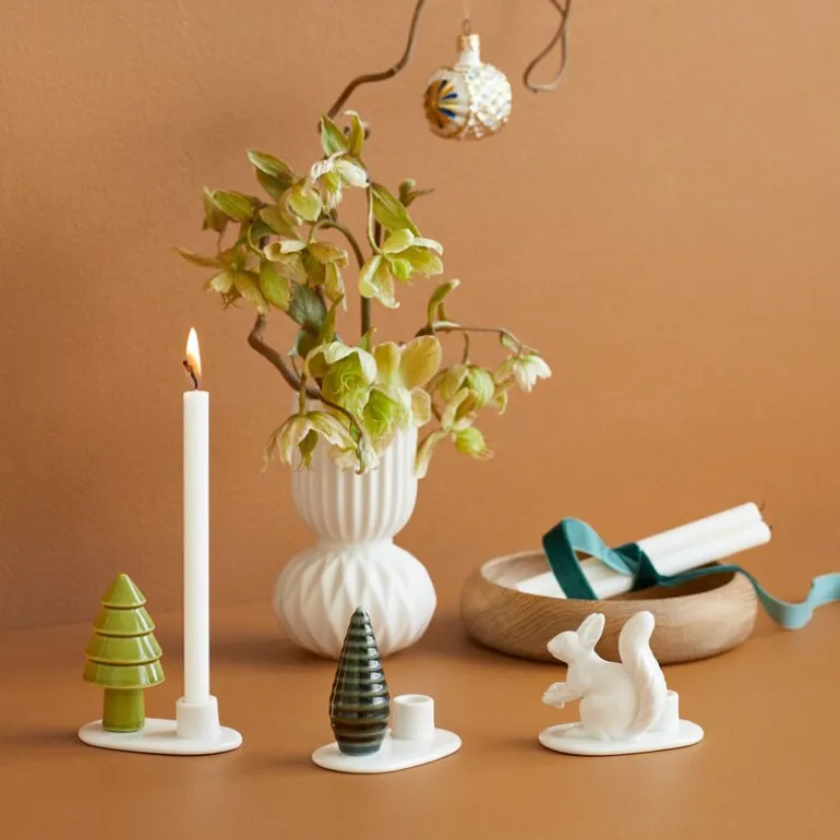 Winter Stories lysestakesett i 3 deler Ekorn fra Dottir bringer naturens magi inn i hjemmet ditt, og lar deg skape en unik vinterhistorie. Designet av Charlotte Adrian, inneholder dette settet tre vakre lysestaker – et lekent ekorn som holder sin skatt, et frodig grønt tre og et mørkere, skulpturert tre – alle designet for 13 mm stearinlys eller som bordkortholdere. Flock Squirrel-settet er ideelt for å pynte stuen, julebordet eller som en kreativ touch til festbordet, og tilfører en følelse av skogens fred og sjarm.