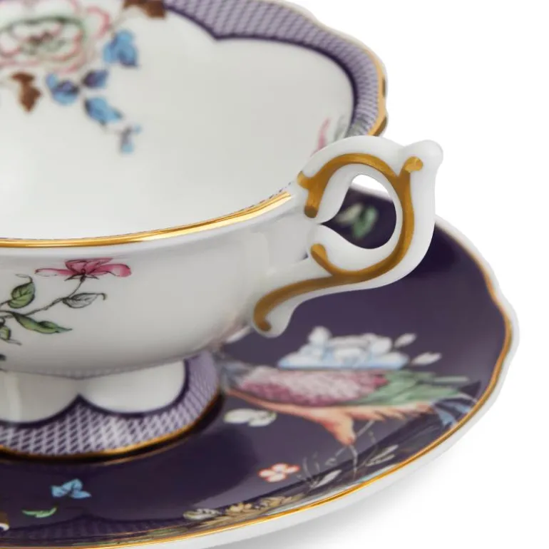 Wonderlust Tcup/Scr Midnight Crane BXD. Ta en reise rundt i verden med Wonderlust-kolleksjonen, en eklektisk samling av mønstrede skåler, krus, middagstallerkener, duftlys, bilderammer og mer, alt inspirert av underverkene ved å reise fra Europa til Asia. Her vil du avdekke fargerike, eklektiske design inspirert av den eksepsjonelle skjønnheten til eksotiske blomster og planter fra de forskjellige kontinentene.Alle delene presenteres i vakre Wedgwood-blå gaveesker som er klare for å feire alle livets spesielle øyeblikk.