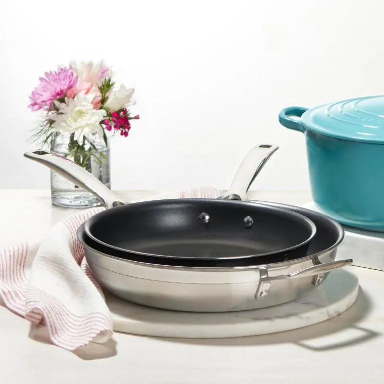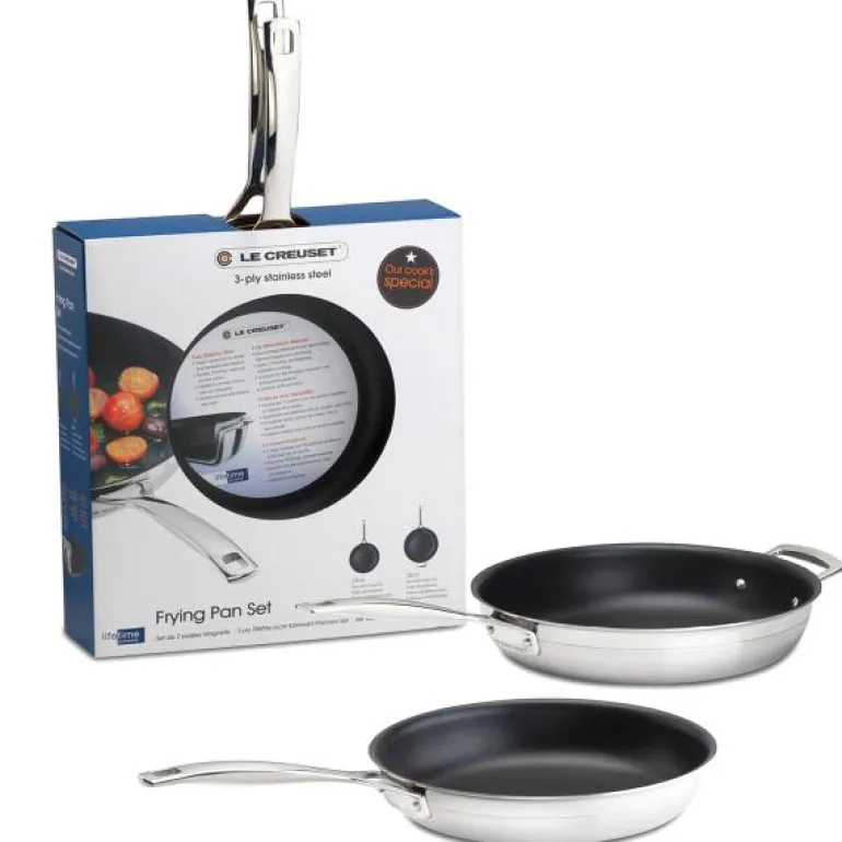 Dette settet med to stekepanner i rustfritt stål (24 cm og 28 cm) vil hjelpe deg med å tilberede de lekreste retter. Takket være konstruksjonen med flere lag og slitesterkt non-stick-belegg er de ideelle for fettfattig matlaging. Maten glir lett av stekepannene, så man trenger bare en liten mengde fett ? eller ikke noe fett i det hele tatt.