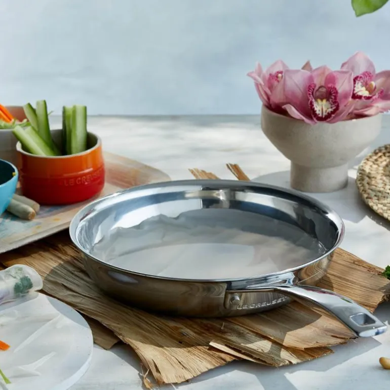 Le Creusets 3-PLY Classic-panne 24cm uten belegg er ideell til steking av kjøtt, fisk og grønnsaker ved høye temperaturer og til klassiske sautéretter. 3-PLY Classic-stekepannen er konstruert med tre-lags-teknologi: Stekepannen har en aluminiumskjerne som er innkapslet mellom to lag av rustfritt stål, noe som skaper optimale betingelser for effektiv varmeledning i hele pannen. Stekepannen har i tillegg brukervennlige detaljer som dryppfri hellekant og varmebestandige håndtak festet med nagler. 3-PLY Classic-stekepannen tåler oppvaskmaskin, alle typer varmekilder inkludert induksjon, og opptil 260 °C i ovnen.