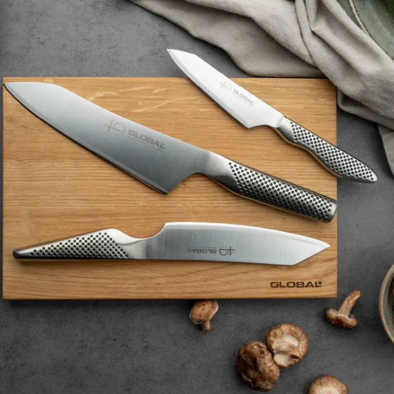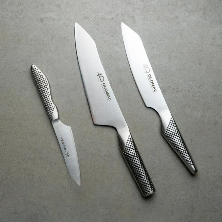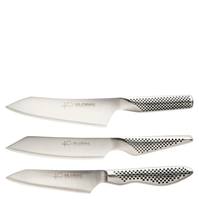 Globals eksklusive 40-årsjubileums knivsett består av tre høykvalitetskniver som er nøye utvalgt for å markere denne spesielle anledningen. Global har vært en ledende aktør i kjøkkenverdenen siden lanseringen, og med dette settet feirer de fire tiår med enestående håndverk og innovasjon. Settet inkluderer den unike jubileumskniven kiritsuke på 15 cm, som er perfekt for presisjonsarbeid og raffinert kutting. I tillegg får du en allsidig kokkekniv på 18 cm, ideell for de fleste oppgaver på kjøkkenet, og en praktisk universalkniv på 11 cm, som gir maksimal fleksibilitet til mindre oppgaver.