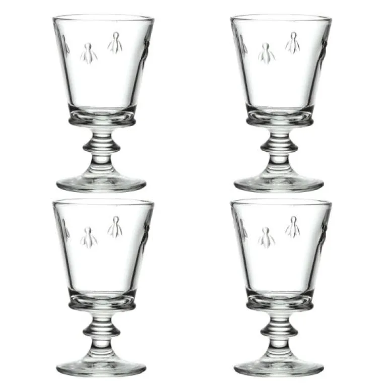 Eske med 4 stykk vinglass 24 cl, fra Abielle serien til franske La Rochere. Vinglassene er dekorert med Napoleon-bier og passer til både røde, hvite og roséviner men også til juice, vann og drikke. De fire glassene kommer i en gaveeske.