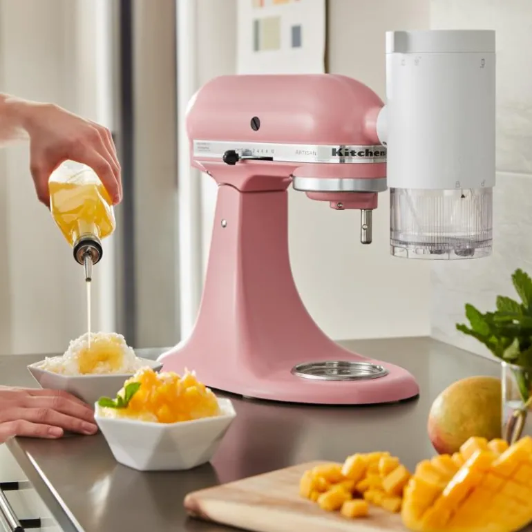 Accessory shave ice-tilbehør 5KSMSIA kan brukes på alle KitchenAid 4.3 L og 4.8 L Tilt-Head kjøkkenmaskiner, og kjøkkenmaskiner med bolleløft.