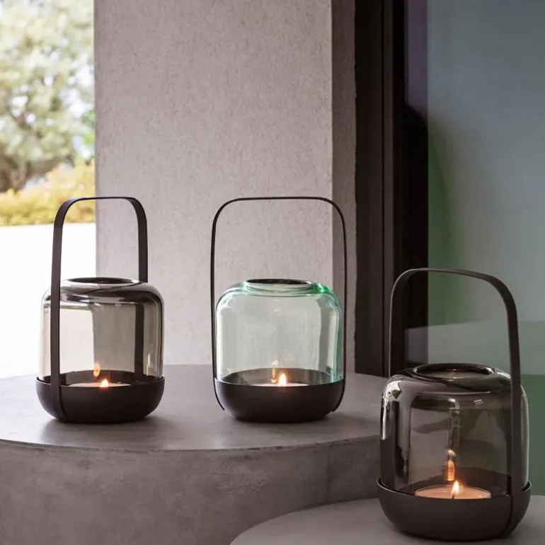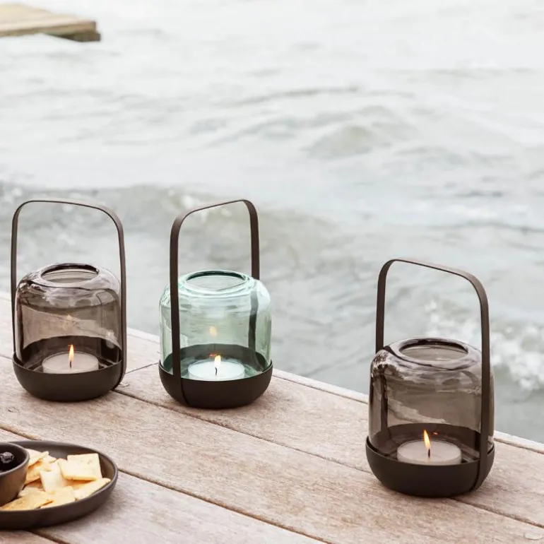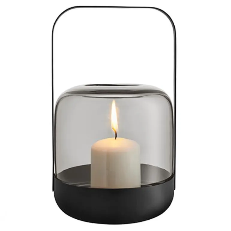 Det praktiske håndtaket i pulverlakkert stål gjør det enkelt å flytte lykten dit du ønsker. Glasset løftes lett når lyset skal tennes, og lykten passer til vanlige telys. Kombiner gjerne med lykten i Stone-nyansen for et spennende, kontrastfullt uttrykk.