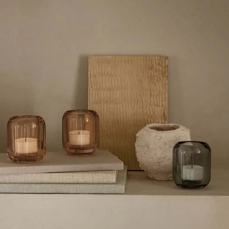 Acorn lyslykter fra Eva Solo gir en sofistikert glød til hjemmet. Det fargede glasset reflekterer lyset på en vakker måte, og lyktene kan brukes hver for seg eller sammen for en harmonisk effekt.