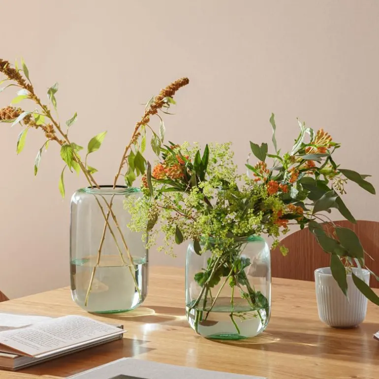 Glassmaterialet gir en naturlig lysrefleksjon som fremhever vasens form og gir et lett og elegant uttrykk. Perfekt både til en frodig bukett eller en enkelt snittblomst som får stå i sentrum.