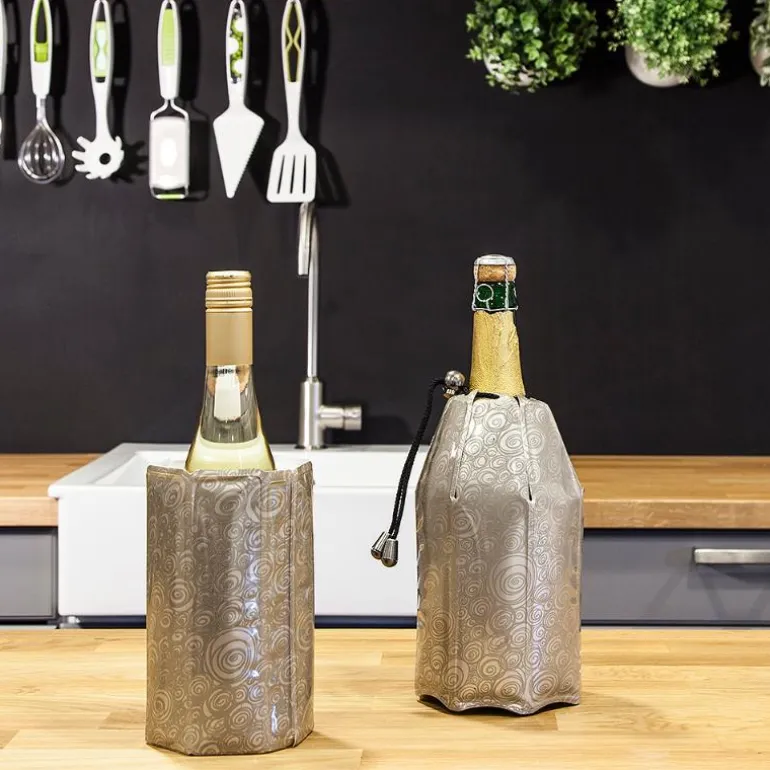 Vacu Vin’s Active Wine & Champagne Cooler gaveeske i platinum løser utfordringen med å raskt kjøle ned drinker og holde dem kalde med Active Coolers! Disse fantastiske Active Coolers kan best beskrives som superkalde, fleksible isjakker. Når de tas ut av fryseren, kan de enkelt skyves over flasken. På bare noen få minutter vil drikken bli nedkjølt, og den vil holde seg kjølig i flere timer.