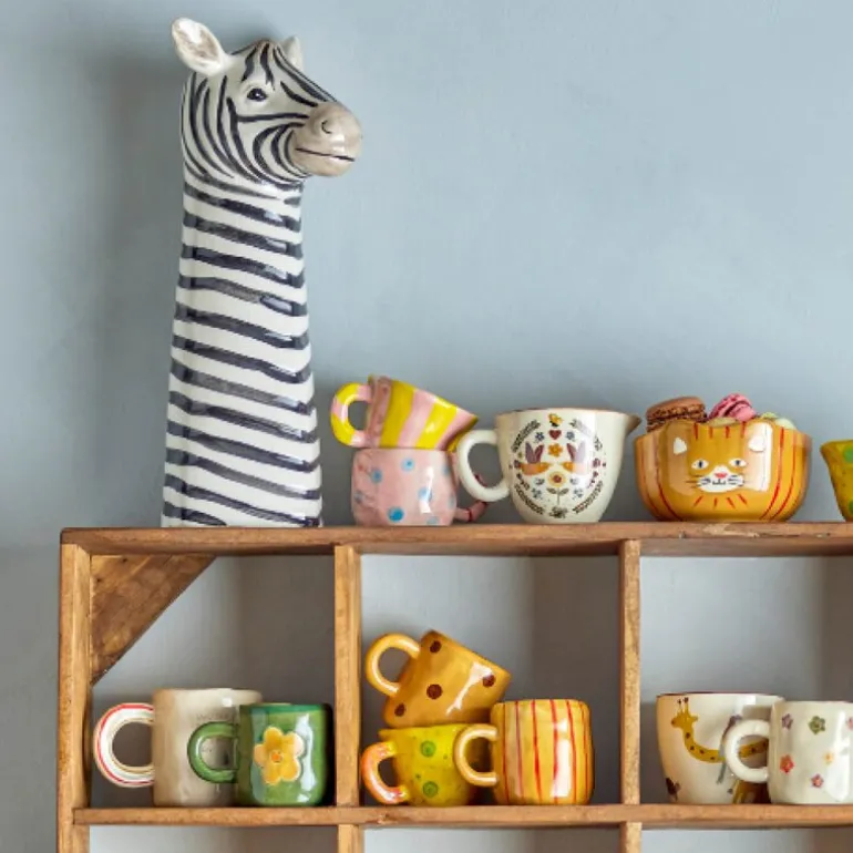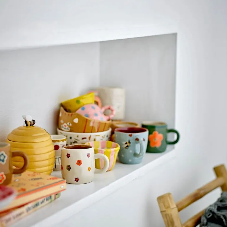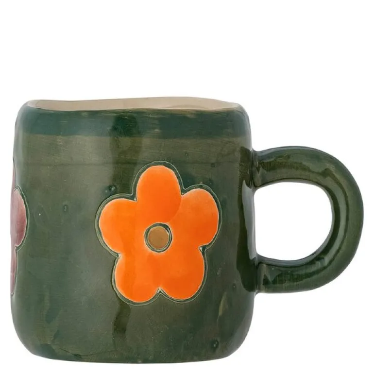 Addy krus 13 cl i grønn fra Bloomingville MINI har et sjarmerende design med en mørkegrønn glasur og store, håndmalte blomster i vakre farger. Den ujevne formen gir kruset et unikt uttrykk og passer perfekt for små barnehender.