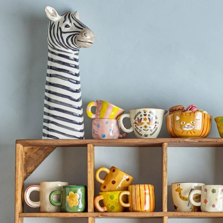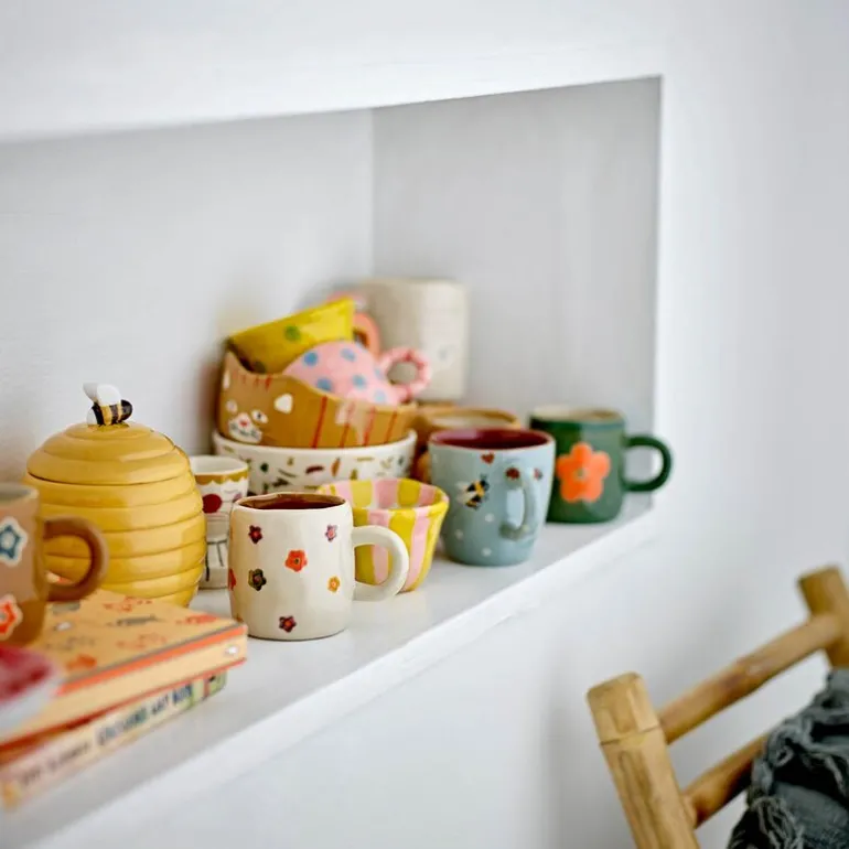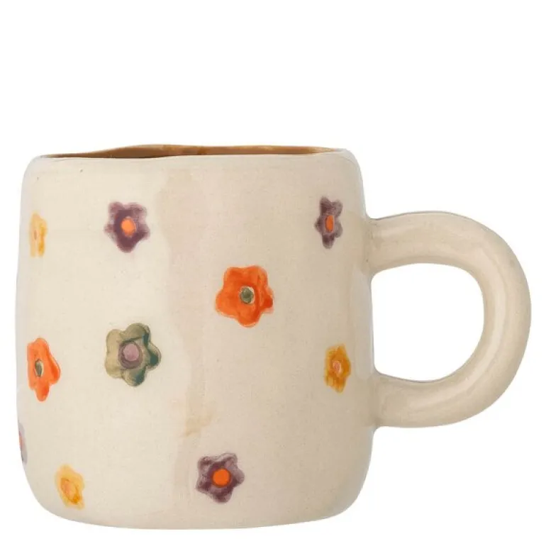 Addy krus 13 cl i natur fra Bloomingville MINI har et sjarmerende design med en lys glasur og store, håndmalte blomster i vakre farger. Den ujevne formen gir kruset et unikt uttrykk og passer perfekt for små barnehender.