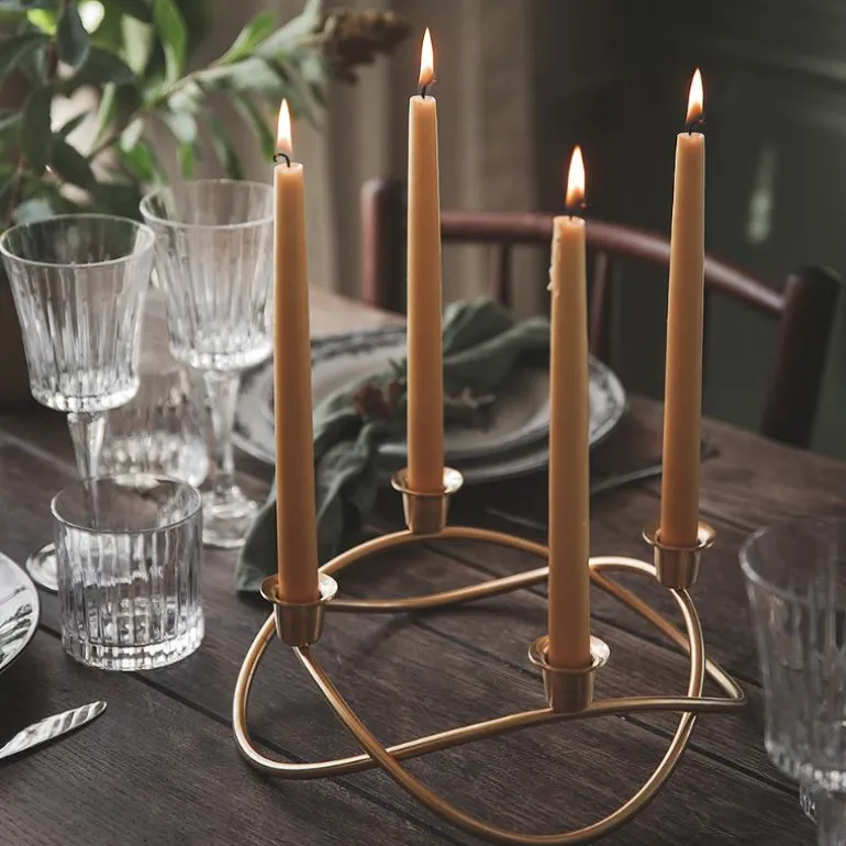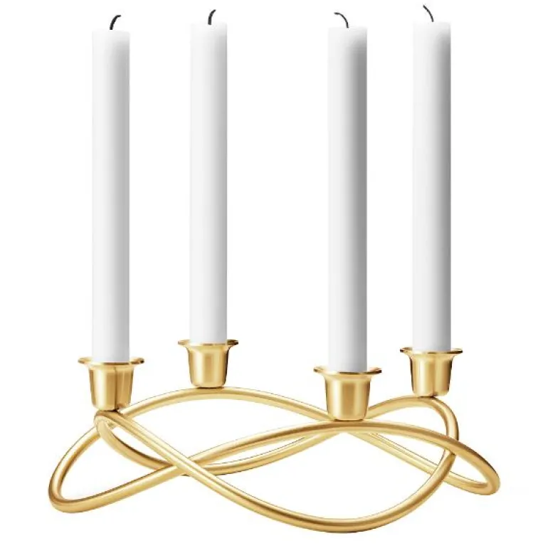 Adventsstake fra Georg Jensen. Adventsstakens form stammer fra den traditionelle julekransen. Den er enkel, så du har mulighet til å tilføre dit eget julepreg. Ved juletid kan du veve grangrene eller røde bånd inn i lysestakenes og skape en fantastisk juledekorasjon. Gullets varme understreker den avslappede julestemning og oppfordrer hele familien til å møtes rundt bordet. En elegant måte å feire julens traditioner på.