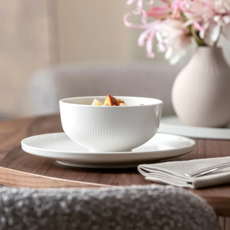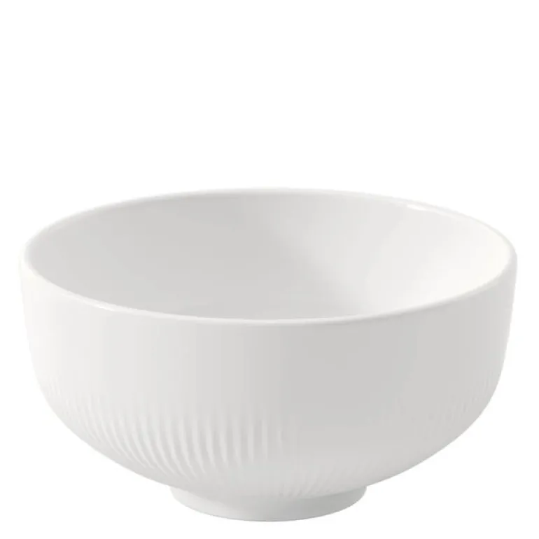 Afina skål 13 cm (35 cl) i hvitt porselen fra Villeroy & Boch er en elegant og praktisk detalj for ethvert dekket bord. Med sitt teksturerte relieff inspirert av solens konsentriske stråler skaper den visuell dybde og taktil interesse.