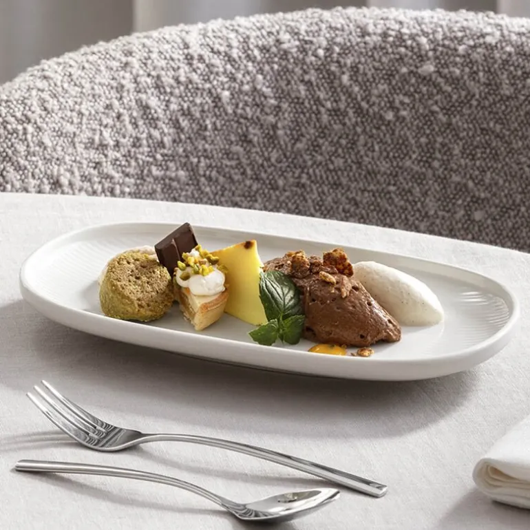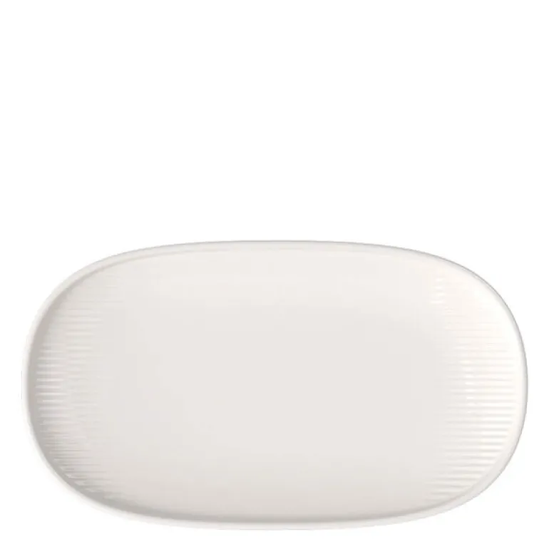 Afina tallerken 23×13 cm i hvitt porselen fra Villeroy & Boch kombinerer funksjon og eleganse på det dekkede bordet. Det ringformede relieffet, inspirert av solens stråler, gir et unikt uttrykk og en spennende taktil opplevelse.