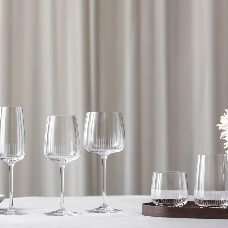 Afina vannglass fra Villeroy & Boch i klart krystallglass, 20 cl, kommer i sett på 4 og gir borddekkingen et eksklusivt løft. Den delikate solstrålegraveringen skaper et vakkert spill i glasset – perfekt for vann, men også flott som en del av en komplett glasserie.