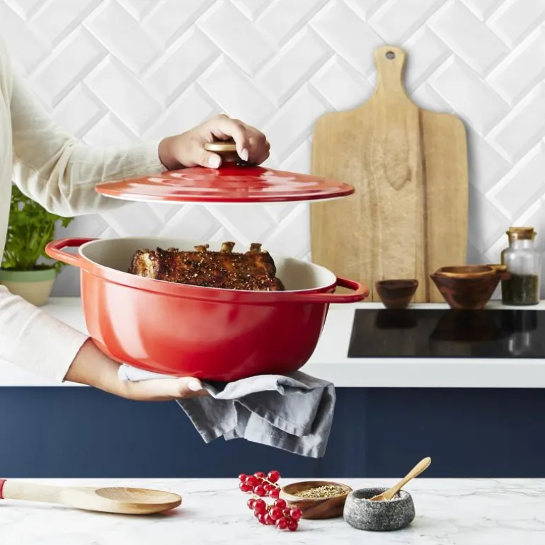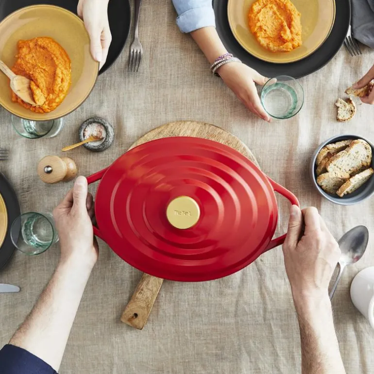 TEFAL Air Oval Gryte 5,7L 30 cm rød har alle fordelene til en tradisjonell støpejernsgryte, men i en lett og moderne design.