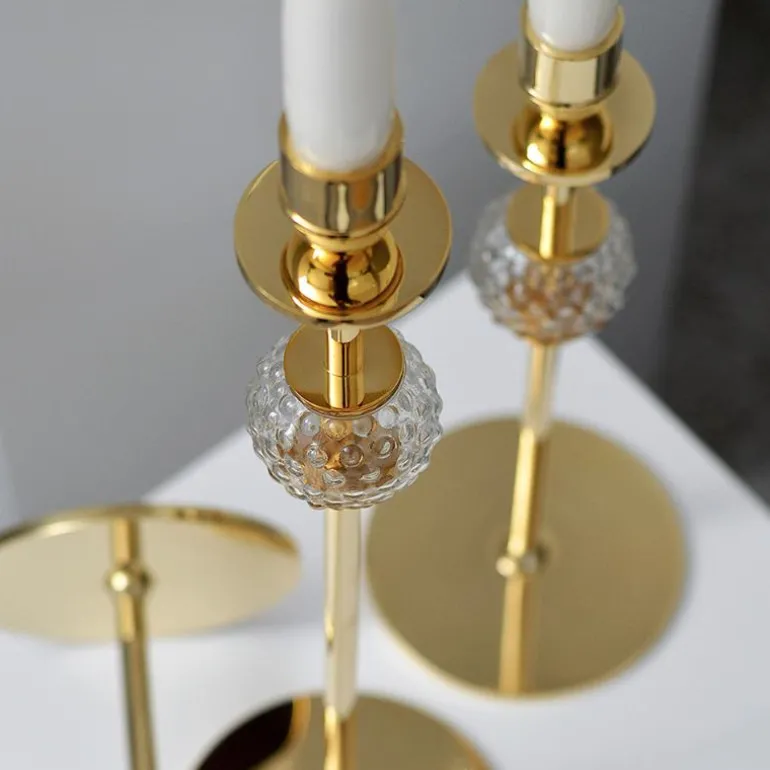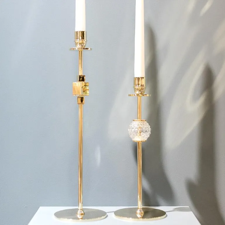 Alba lysestake 40 cm i messing/gull og en håndlaget glasskule fra Hilke Collection. Navnet Alba kommer fra italiensk og betyr soloppgang, noe som gjenspeiler lysestakens elegante design. Denne lysestaken passer perfekt både på bordet og ved vinduet. Den finnes i ulike størrelser og er like vakker alene som sammen med andre lysestaker fra samme kolleksjon.