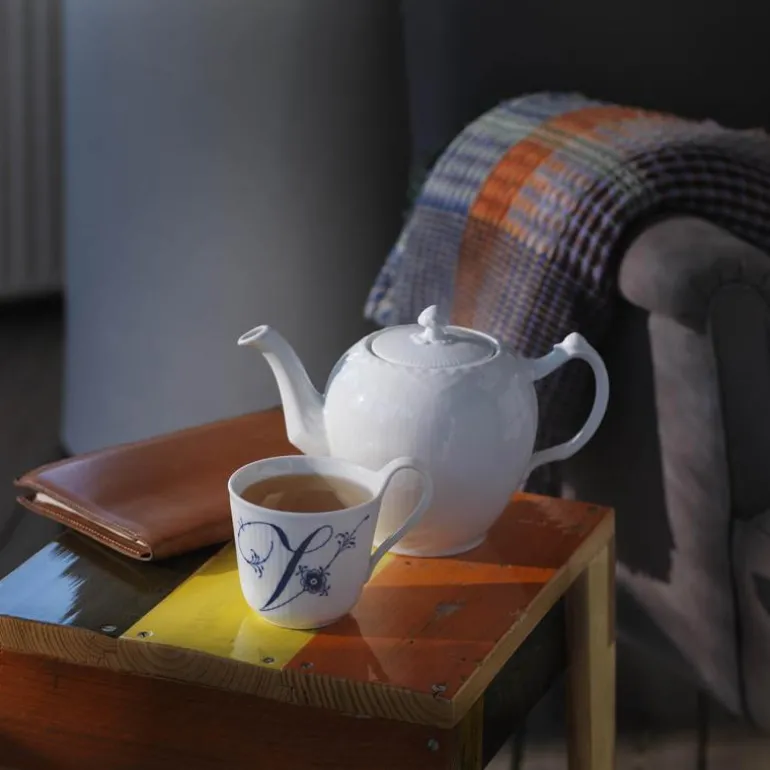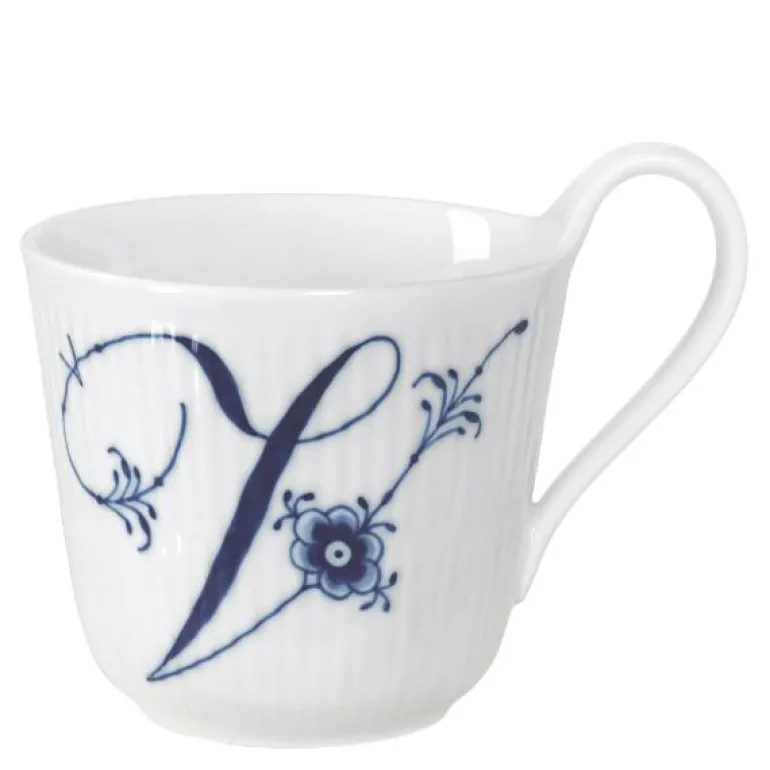 Høyhankskruset alfabet V på 33 cl er en Royal Copenhagen-klassiker, og hvorfor ikke sette et ekstra personlig preg på favorittkoppen din? På dette Alfabet-kruset med bokstav er de delikate palmettene og blomstene fra Musselmalt Riflet-kolleksjon vakkert integrert i bokstaven og håndmalt i klassisk koboltblå.