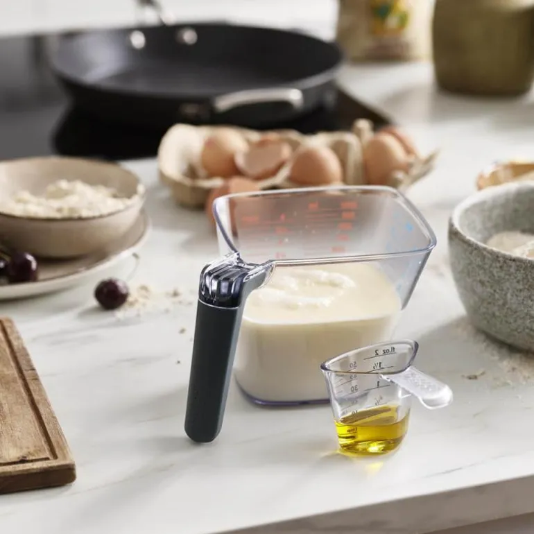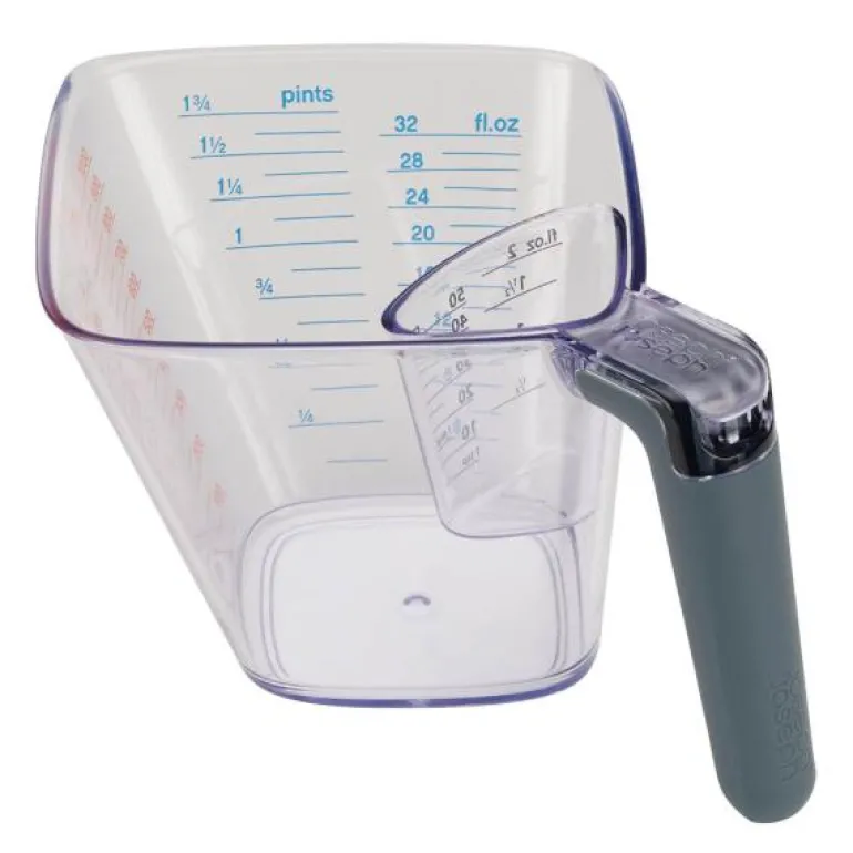 Dette praktiske målebegeret har skriften i en slik vinkel at du kan lese av målebegeret ovenfra.