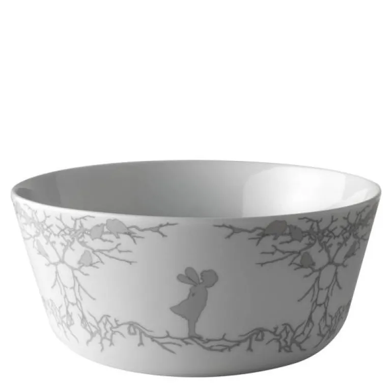 Bolle i serviset Alv fra Wik & Walsøe. Inspirert av troen på det umulige. Alvene beskrives av designerne selv som skogens engler, og serviset er preget nettopp av grener, fugler og silhuetten av denne flyktige skikkelsen. Delikate tegninger i lys grå mot en hvit bakgrunn.