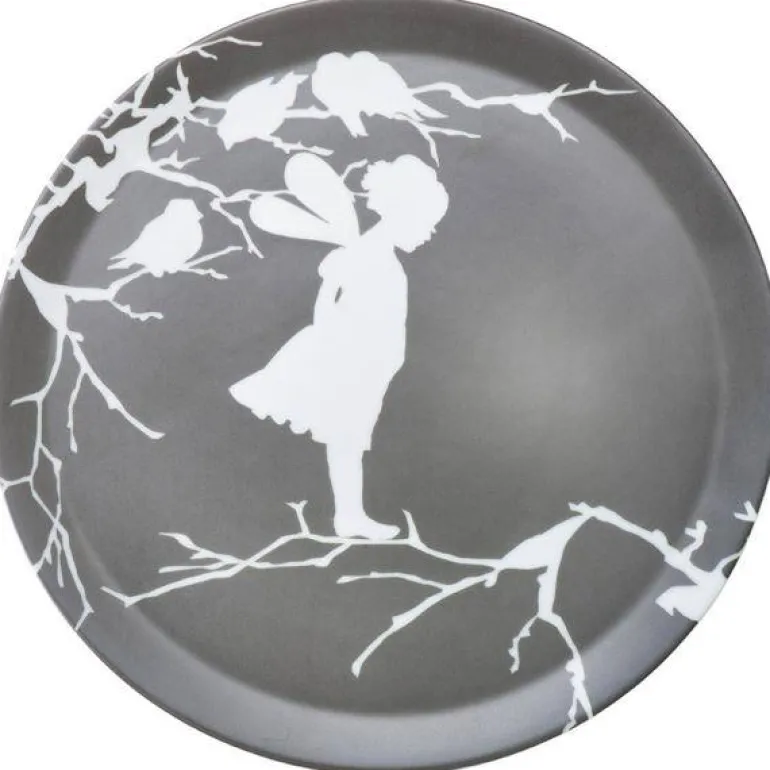Veggfat i serviset Alv fra Wik & Walsøe. Inspirert av troen på det umulige. Alvene beskrives av designerne selv som skogens engler, og serviset er preget nettopp av grener, fugler og silhuetten av denne flyktige skikkelsen. Delikate tegninger i lys grå mot en hvit bakgrunn.