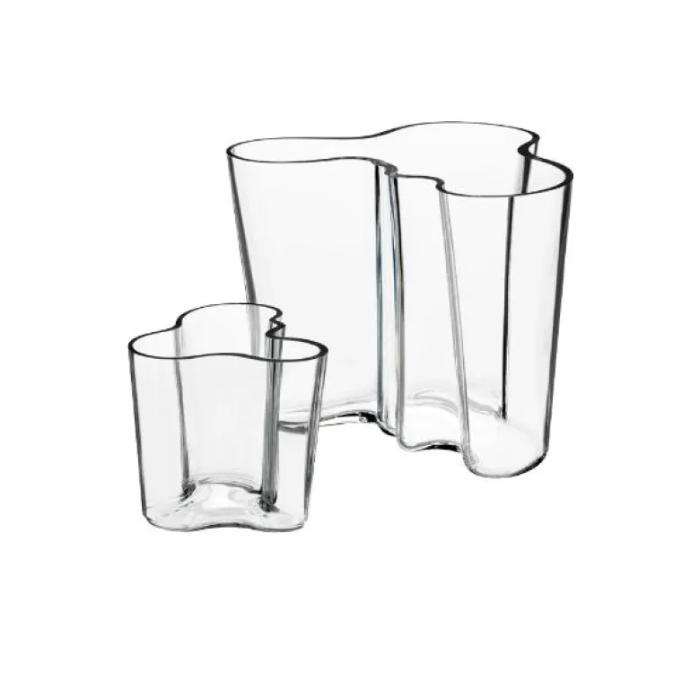 Aalto vase sett 95mm og 160mm klar. Aalto-vasen ble designet av den kjente arkitekten og formgiveren Alvar Aalto i 1936. Vasen blir fortsatt munnblåst på Iittala-fabrikken i Finland, og det kreves sju høyt kvalifiserte og koordinerte håndverkere for å fremstille en Aalto-vase – et ikon for moderne design. Alvar Aalto er uten tvil et av de største navnene innen moderne arkitektur og skandinavisk design. Et allsidig produkt som kan brukes til mer enn blomster. Prøv den f.eks med blomsterløker, snacks eller nøtter. Håndvask anbefales.