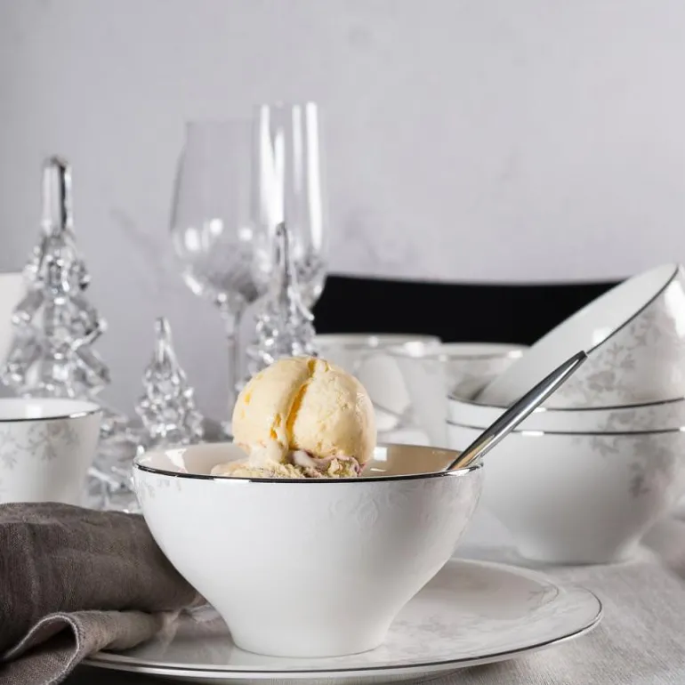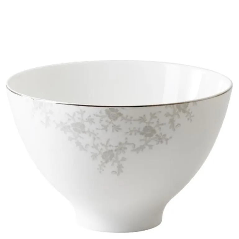 Bolle i serviset Angelina Platinum fra Royal Porcelain. Angelina Platinum er et moderne og romantisk festservise. Serviset har tynne, delikate deler kantet med sølv og er dekorert med lette, blekgrå blomster. Det er ikke uten grunn at serviset er en av våre bestselgere.Serien er produsert av Royal Porcelain, en av Norges største merkevarer innen serviser. Angelina Platinum er laget av benporselen, som er den aller fineste type porselen. Angelina Platinum er egnet for oppvaskmaskin. Angelina Platinum får du kun hos Tilbords. Angelina Platinum er det ideelle serviset å dekke med til alle livets litt ekstra fine anledninger. Den delikate fargepalletten gjør at serviset er like aktuell til alle årstider og kan kombineres med bordpynt i dine favorittfarger. Serien er stor, og inneholder tallerkener i ulike størrelser – til forrett, hovedrett og dessert – serveringsfat i flere størrelser, suppeterrin, sausenebb og salatbolle i flere størrelser. I tillegg får du selvsagt et komplett kaffeservise. Angelina Platinum er populær på våre bryllupslister, og er en serie du kan samle hele livet.