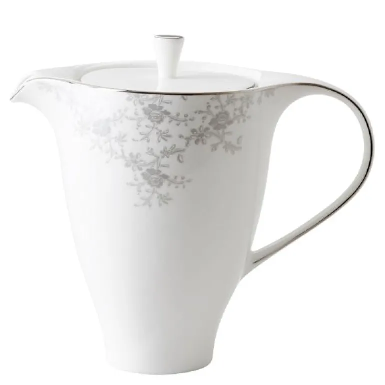 Kaffekanne i serviset Angelina Platinum fra Royal Porcelain. Angelina Platinum er et moderne og romantisk festservise. Serviset har tynne, delikate deler kantet med sølv og er dekorert med lette, blekgrå blomster. Det er ikke uten grunn at serviset er en av våre bestselgere.