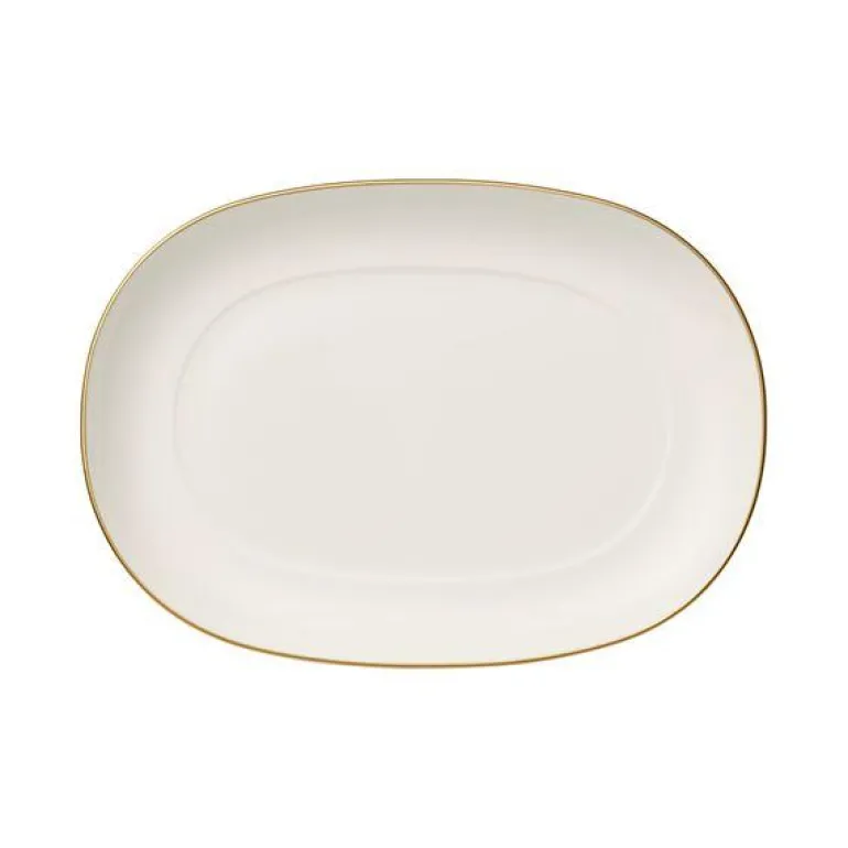 Vakre serveringsdeler med guldkant er supplementet man behøver for å skape et elegant festbord. Dette er fat til sausenebb, men kan også brukes som påleggsfat.
