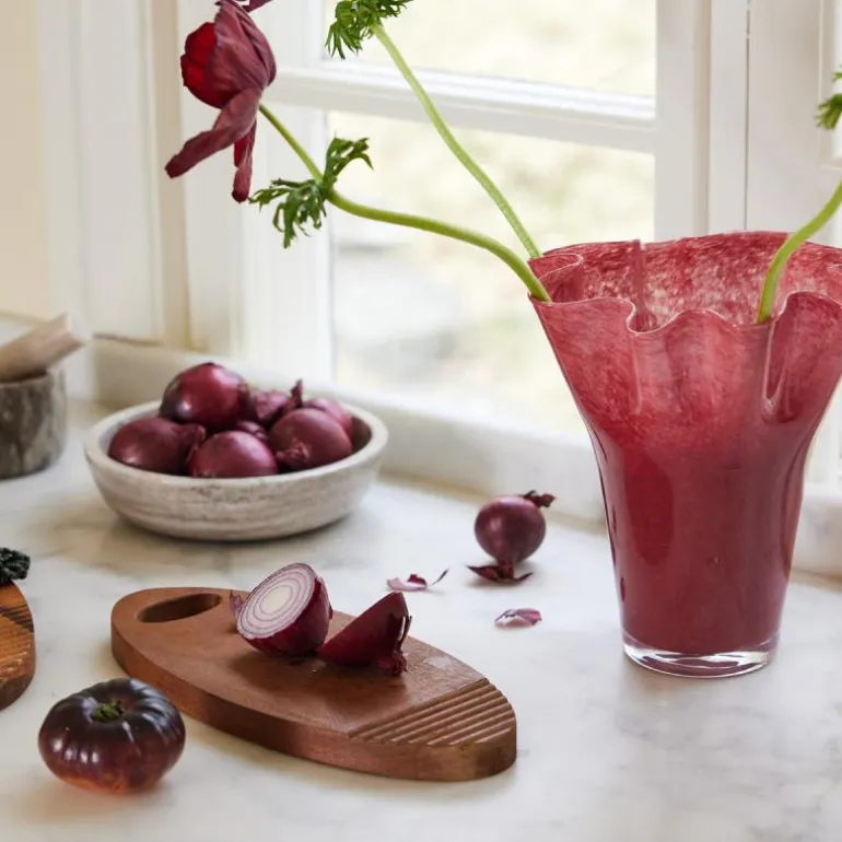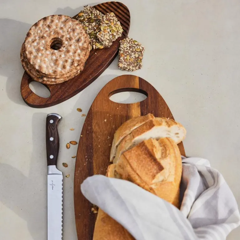 Ante skjærebrett har en oval form, med vakre utskårne striper i den ene enden, og er laget av mørkt robust akasietre. Formen gjør Ante til noe helt spesielt, stilig å ha foran seg når den ikke er i bruk og ekstra praktisk når den settes på bordet. Ante skjærebrett kommer i to forskjellige størrelser, det er laget for hånd og har unike variasjoner i form og farge som kun håndlagde produkter kan ha. Godt å vite er at skjærebrett i tre har lengre holdbarhet og er også skånsommere for knivene.
